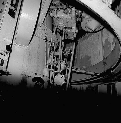 Bloc 5. Tourelle. Etage intermédiaire. Vue rapprochée du mécanisme de rotation, sous la chambre de tir. A gauche, corps du pivot. A droite bras télescopique et index de pointage de direction, en prise sur la circulaire graduée.