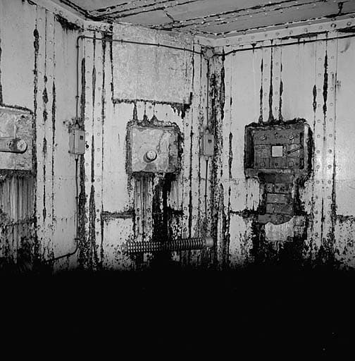 Bloc 5. Etage supérieur. Vue intérieure du poste optique. De gauche à droite : goulotte lance-grenades, gaine optique de Serre la Plate, gaine optique de Fontvive. Créneau de FM.