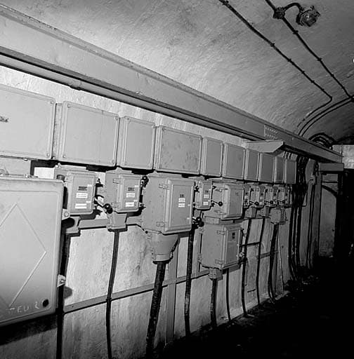 Dessous. Usine. Tableau électrique de distribution. De haut en bas, chemin de roulement du pont roulant, coffret du jeu de barres et appareillage des départs.