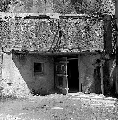 Bloc 1. Vue de face. Façade avec la porte d'entrée et l'arrivée de la voie de 0,60 venant du téléphérique. A gauche, caponnière et créneau de FM de défense rapprochée. Au-dessus, visière et supports de l'antenne radio.