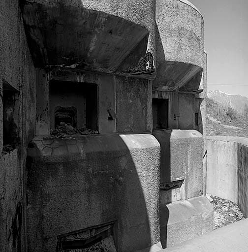 Bloc 5. Casemate de flanquement. Vue rapprochée prise de l'avant, avec les deux embrasures des mortiers de 75-31 et, au-dessous, dans le fossé diamant, les embrasures des mortiers de 81 mm.