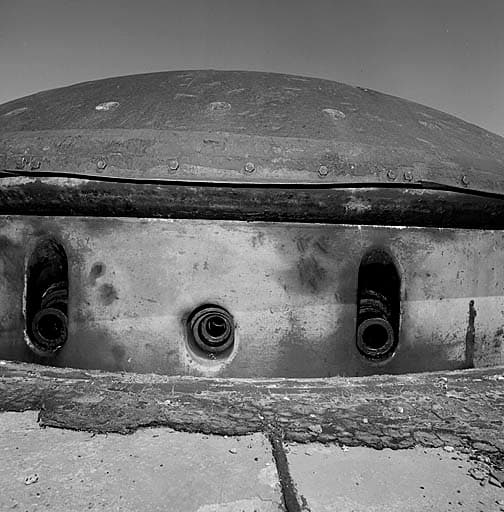 Bloc 5. Vue rapprochée de la tourelle de 75-33 en batterie. Au centre, créneau de la lunette de tir direct, encadrée par les embrasures des bouches à feu.