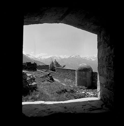 Terre-plein supérieur de l'ouvrage vu par une fenêtre du poste optique. A droite, tourelle de l'escalier venant du casernement. A l'arrière-plan, les cimes du massif de Restefond.