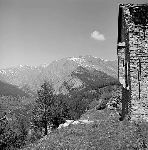 Vue sur la vallée du Parpaillon. Au centre, massif de la tête de l'Infernet et du Vallon Claus. Au premier plan, avant-corps du casernement.