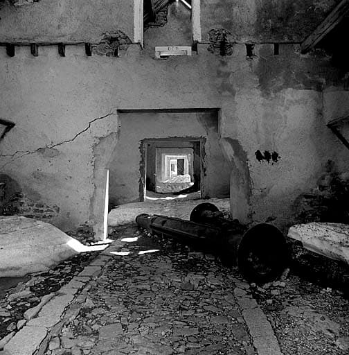 Ecurie g. Vue intérieure. Au sol, colonnes du mécanisme intérieur de deux cloches lance-grenades.