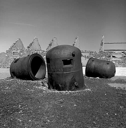 Cloches cuirassées en dépôt sur le terre-plein des écuries. Au centre, debout, cloche GFM A. A gauche, la même couchée. A droite, couchée, cloche lance-grenades.