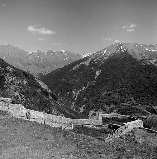 Vue prise vers le sud-est. Au premier plan, le parapet du front de tête. Derrière, à gauche, le vallon de Sagnes (torrent d'Abriès).