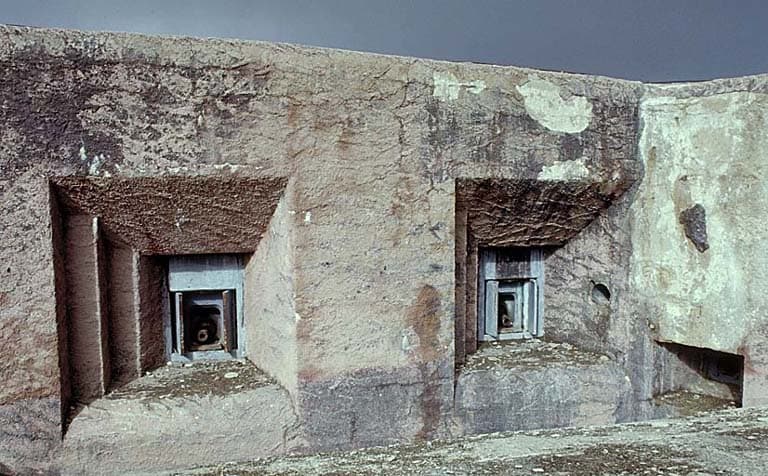 Bloc 6. Vue rapprochée des embrasures des deux canons obusiers de 75 M 32. A droite, créneau FM.
