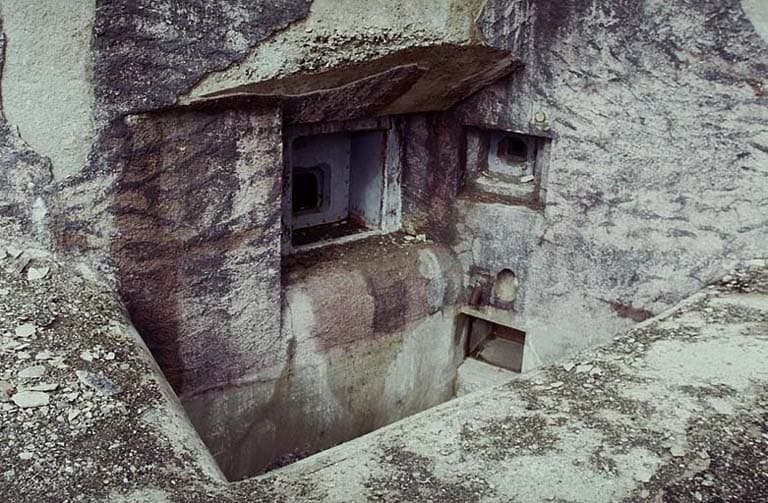 Bloc 6. Vue extérieure de la casemate de 75-31. A droite, créneau de FM de flanquement, au-dessus de l'issue de secours.