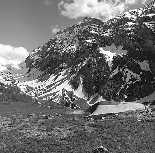 Vue des avants de l'ouvrage. A droite, le bloc 3. Derrière, vallon du torrent de Fouillouse et massif du rocher de Saint-Ours.