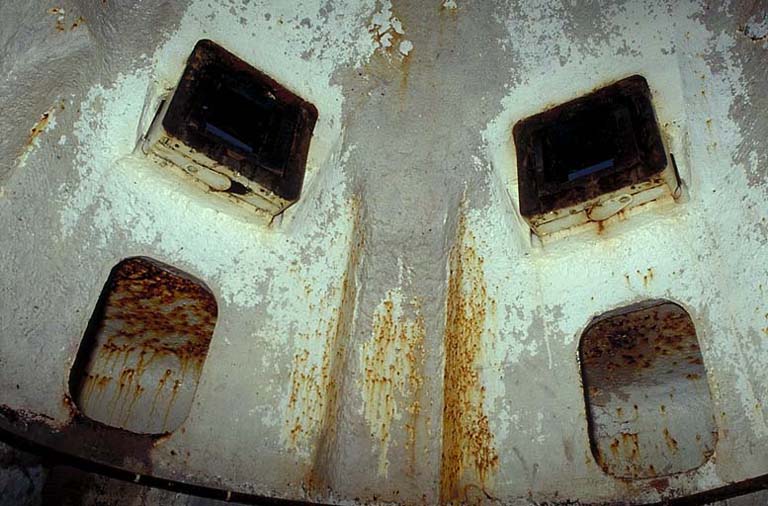 Vue intérieure d'une casemate cuirassée Pamart, avec les deux créneaux de mitrailleuse transformés en créneaux de FM type A.