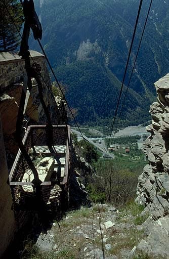 Téléphérique. Vue plongeante prise de la recette supérieure dans l'axe du câble. En bas, le bâtiment de la recette inférieure. A gauche, benne et, derrière, mur d'enceinte du front sud.
