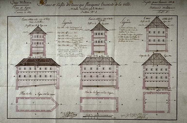 Plans et profils des tours qui flanquent l'enceinte de la ville de Seyne.