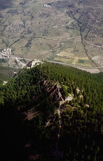 Vue aérienne prise du sud. Derrière et en contrebas, l'ouvrage de Roche la Croix et le village de Meyronnes.