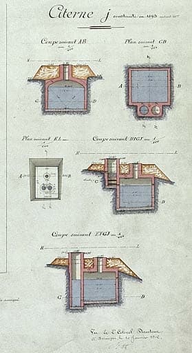Position de la Lauzette. Baraques g. Baraque k. Baraque i. Baraque t. Citerne j. [Plans et coupes] 1901. Détail : Citerne j construite en 1893.