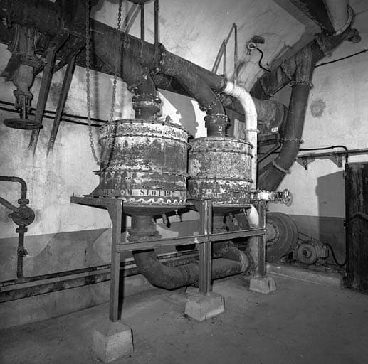 Dispositif de ventilation. Batterie de filtres avec by pass (en blanc) et, à droite, en bas, le ventilateur "gazé" et, en haut, le ventilateur "air pur".