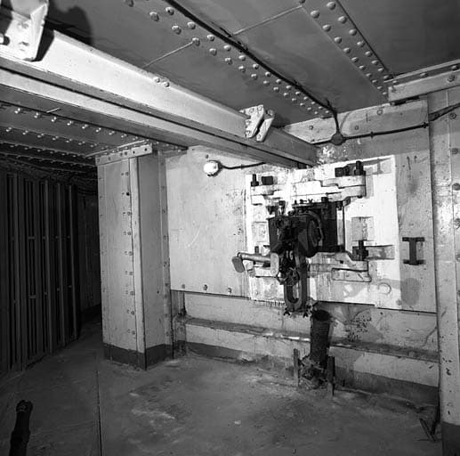 Casemate active (bloc 1). Vue intérieure. Remarquer le créneau équipé, improprement, d'un affût de JM de cloche. Au-dessus, birail porteur du canon de 47. A gauche, étagères à munitions.