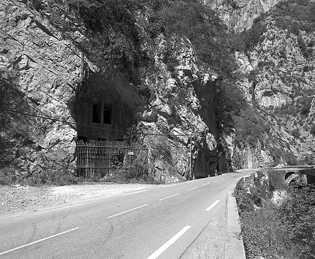 Vue d'enfilade de la gorge et, à gauche, de l'ouvrage prise du sud. Au fond, pont de la Vésubie.