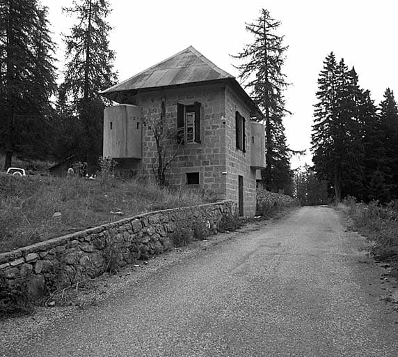 Poste défensif ou blockhaus. Remarquer les bretèches d'angle en béton armé.