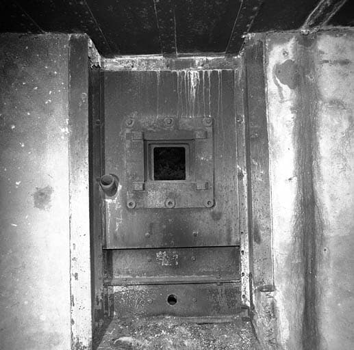 Bloc 1. Vue intérieure de la chambre de tir. Créneau JM nord-ouest sous niche blindée, avec trémie 3 simplifiée. A gauche, goulotte lance-grenades de fossé.