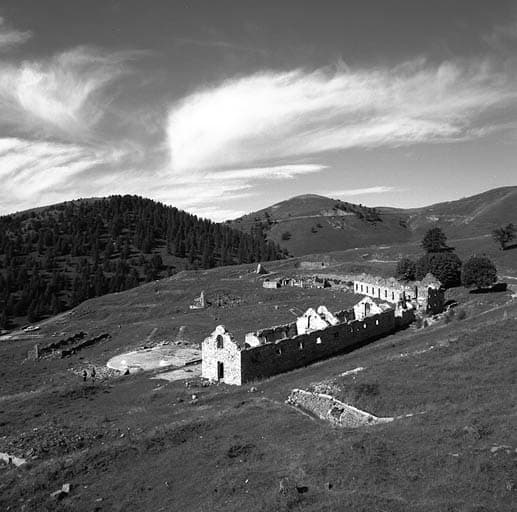 Dessus pris du bloc 5 vers le sud-ouest. Au premier plan, ruines de l'ancien casernement (de gauche à droite, bâtiments T6, 02, T5). Au fond, de gauche à droite, sommets et ouvrage de la Forca et Millefourches.