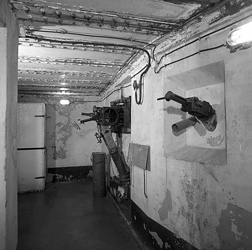 Bloc actif (B 4). Etage supérieur. Aile gauche. Vue intérieure de la chambre de tir du JM 1 de casemate. Au premier plan, à droite, goulotte lance-grenades.