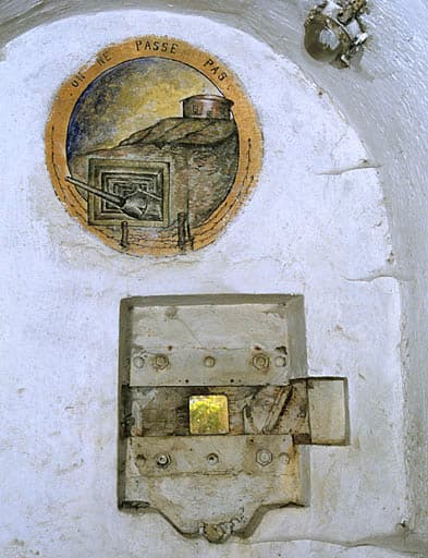 Entrée des hommes. Coffre d'escarpe, vue intérieure. Insignes des troupes de forteresse au-dessus du créneau FM.