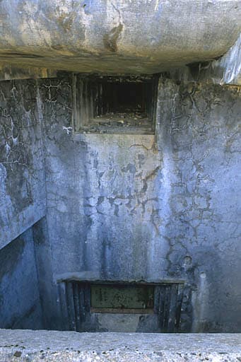 Bloc 1. Face nord-est. Vue rapprochée de la partie droite. En haut, créneau du JM de casemate. En dessous, embrasure de mortier de 81 de casemate.