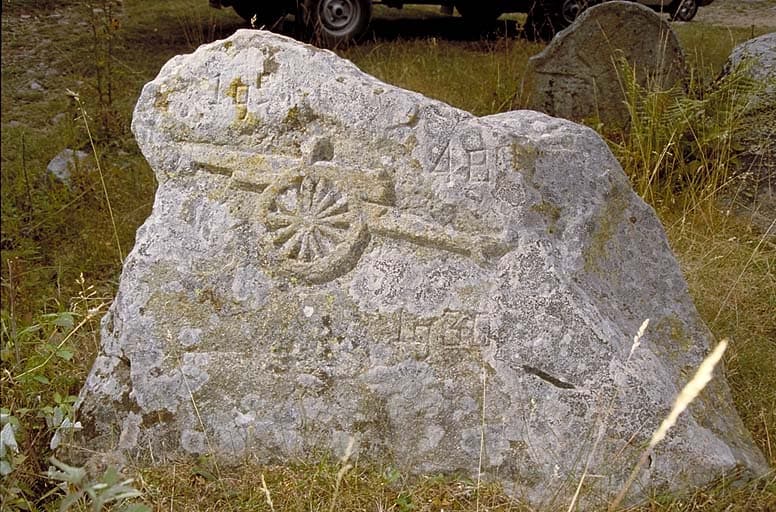 Pierre sculptée représentant un canon de 75 avec inscription "19 (RA ?)" 4e Bie. 1930.