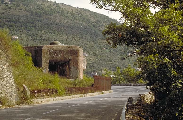 Bloc actif (B 4). Flanc droit, vue extérieure. Créneau du JM 5 sous casemate. A l'arrière plan, mont et ouvrage de l'Agaisen. Au premier plan, la route D 2204 et la grille défensive du bloc. ; Sospel, ouvrage mixte de Saint-Roch.