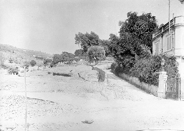 Travaux de création de l'avenue de Vallauris et de la grande demi-lune à l'entrée du jardin. Vue prise à l'emplacement de la demi-lune vers le nord-est : l'ancien tracé du chemin vicinal de Vallauris et l'ancienne limite du jardin. A droite, la conciergerie et le portail.