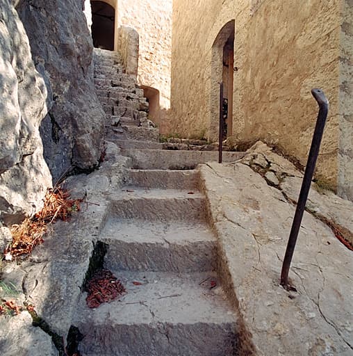 Corps de garde 32. Détail de marches taillées dans le roc de l'escalier vers l'étage du corps de garde.