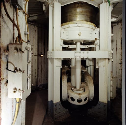 Tourelle à éclipse 75 / 33 du bloc 5, vue intérieure du niveau 1, infrastructure, pivot de la tourelle et bielles du balancier d'éclipse.