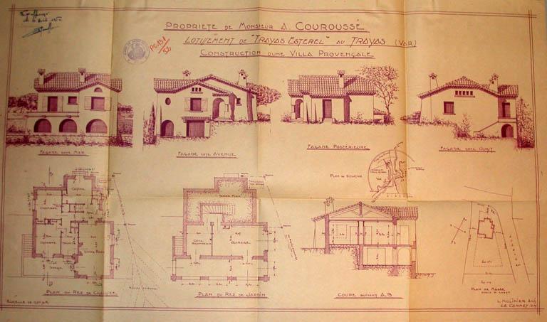 'Propriété de Monsieur A. Courousse. Lotissement de ''Trayas Esterel'' au Trayas (Var). Façade côté mer. Façade côté avenue. Façade postérieure. Façade côté ouest. Plan du rez-de-chaussée. Plan du rez-de-jardin. Coupe suivant A.B. Plan de masse.'