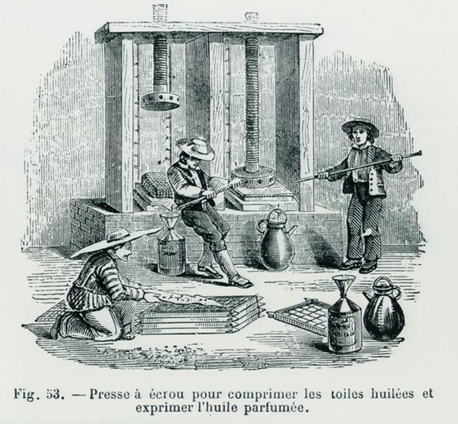 Presse à écrou pour comprimer les toiles huilées et exprimer l'huile parfumée.