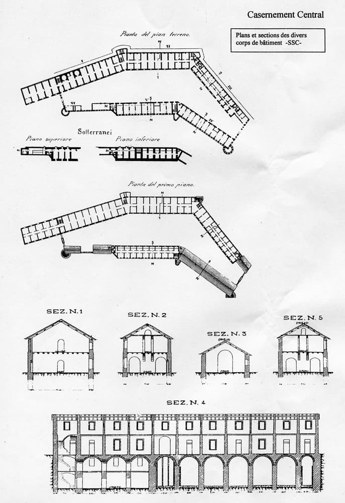 Fascicolo contenente il piano d'insieme [...] del Colle di Tenda [Document contenant le plan d'ensemble [...] du Col de Tende]. Détail : casernement Central, plan et sections des divers corps de bâtiment -SSC-.