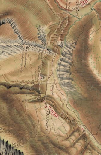 Cartes des frontières Est de la France, de Colmars à Marseille. Détail de la feuille 200-63 : le camp retranché de Tournoux avec la redoute des Cassons au nord du village. ; Cartes des frontières Est de la France, de Colmars à Marseille. Détail : le camp de Tournoux et la redoute de Berwick, carte levée entre 1764 et 1769.