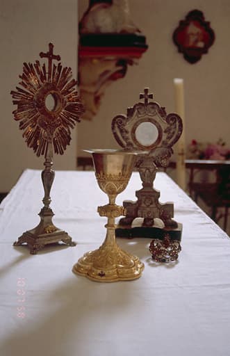calice, ostensoir (ostensoir-soleil), patène, couronne de statue, reliquaire