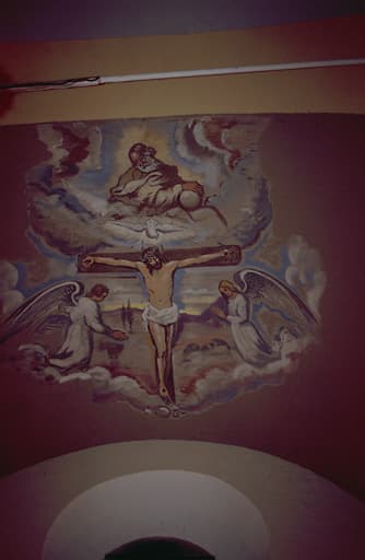 peinture monumentale : Dieu le Père, colombe du Saint-Esprit et Christ en croix entourés de deux anges adorateurs