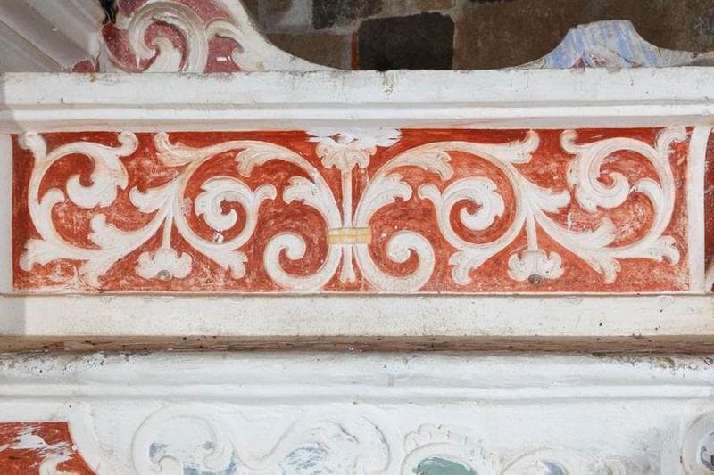 Détail du décor peint et stuqué du gradin supérieur du maître-autel.