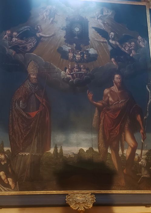 tableau : Triomphe du Saint-Sacrement entre un saint archevêque et saint Jean-Baptiste