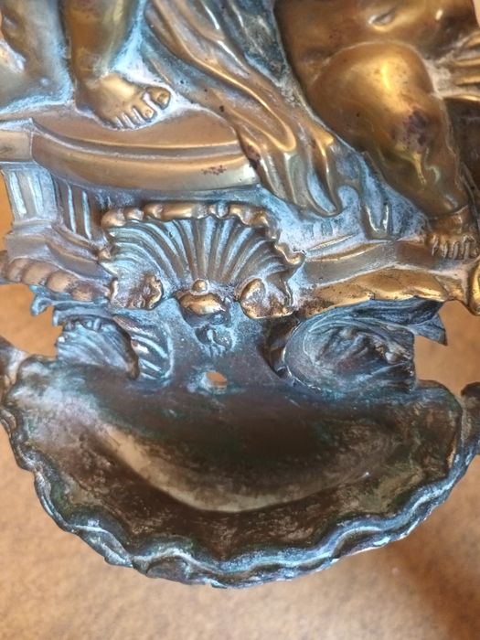 bénitier : Angelots tenant les instruments de la Passion au pied de la croix d'où pend une draperie, détail