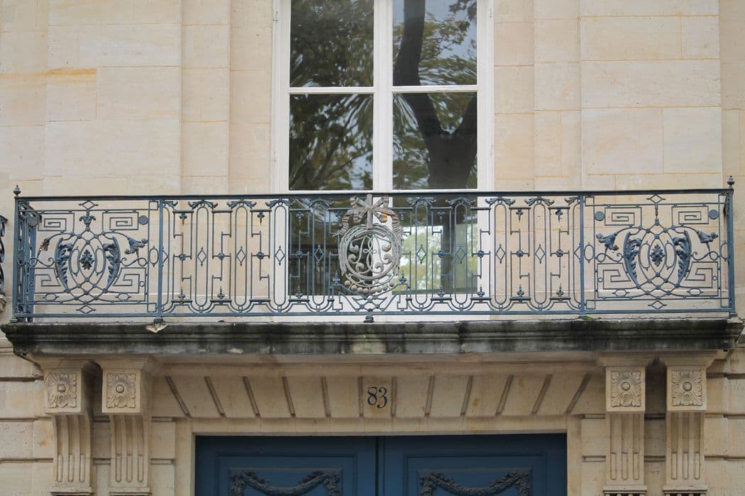 façade sur rue, détail du balcon au-dessus du portail d’accès