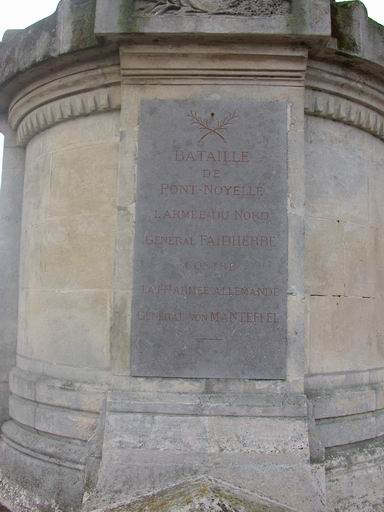 Base de la colonne : plaque portant l'inscription "Bataille de Pont-Noyelle : L'armée du Nord, Général FAIDHERBE, Contre La Ière armée allemande, Général Von MANTEFFEL".