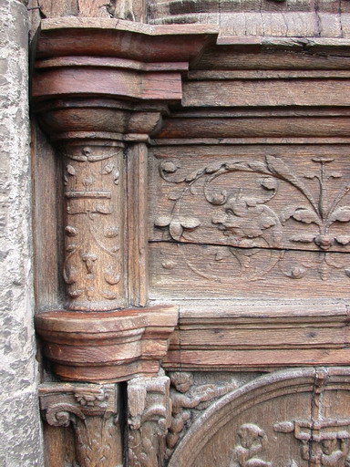 Détail du vantail de gauche en cours de nettoyage, avant peinture (atelier Lehuen, 2002).