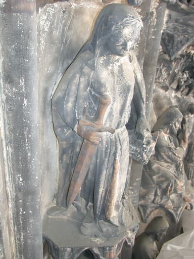 Relief de voussure, côté est du portail, après dépoussiérage et avant nettoyage : Judith portant la tête d'Holopherne.