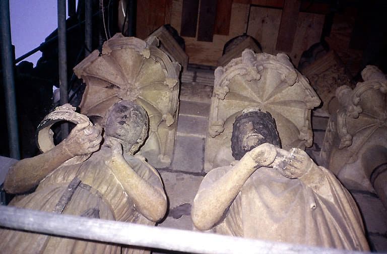 Façade occidentale, portail dit de la Mère Dieu, piédroit : statues monumentales, représentant la Reine de Saba et Salomon, en cours de restauration.