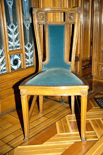 Salle à manger, rez-de-chaussée : chaise en bois sculpté, à motifs de branches et de pommes-de-pin.