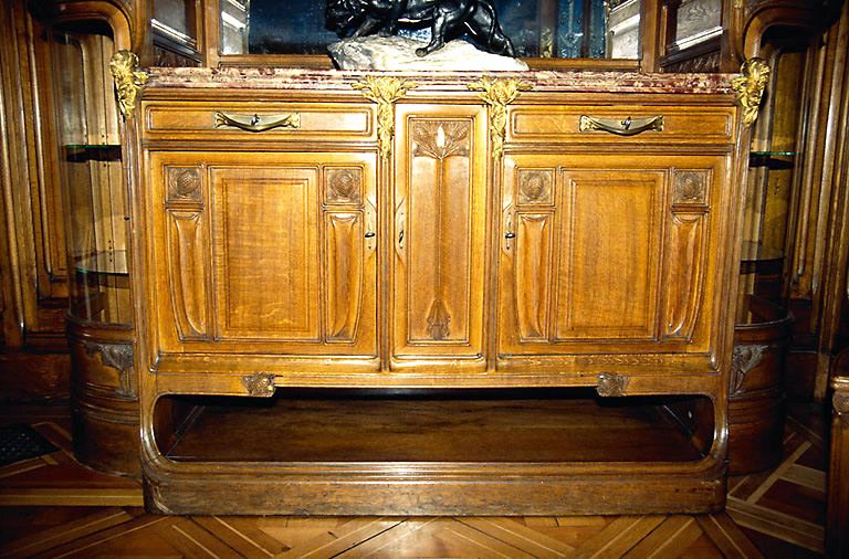 Salle à manger, rez-de-chaussée : meuble en bois sculpté, à motifs de branches et de pommes-de-pin et appliques en bronze ciselé.