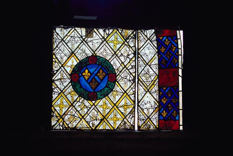 verrière : Panneaux 14, 15 (Ap. R.) quadrillage de jaune d'argent sur lequel se détache des couronnes de feuilles vertes ; bordure, alternance de motifs bleus et rouges entre deux filets blancs.